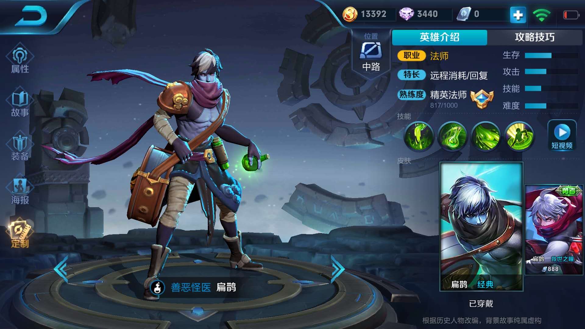 扁鵲在游戲中的定位是法師和輔助,擅長團隊控制和生命恢復,其核心技能如下: